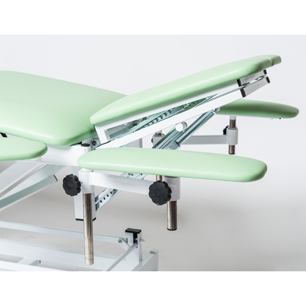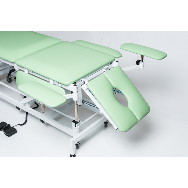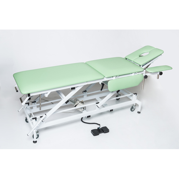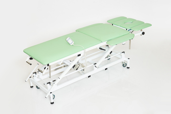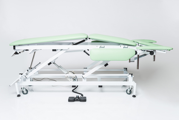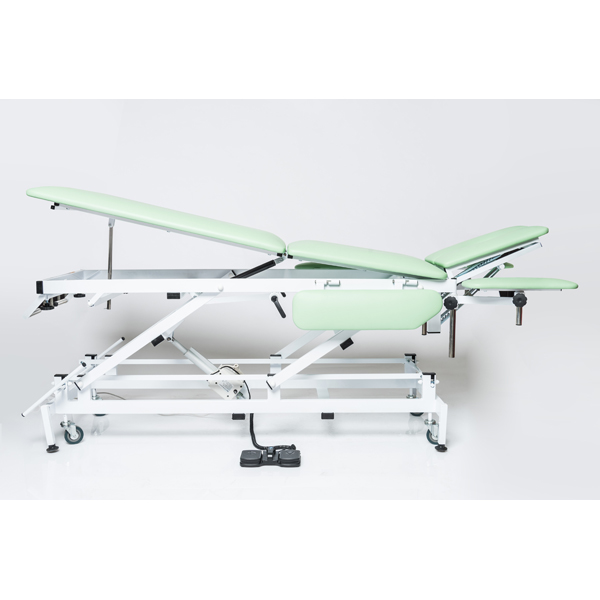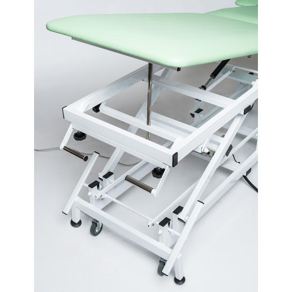 Стол снабжен каркасными опорами для стационарного размещения и колесами для перемещения. Переключение с опор на колеса и обратно происходит с помощью механического педального привода.