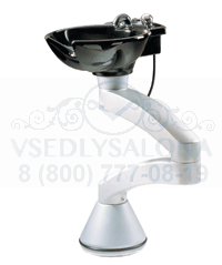 Раковина малая белая, стойка имеет две подвижные секции серого цвета, разворот в горизонтальной плоскости на 360° относительно места крепления, подводка воды в пол.
